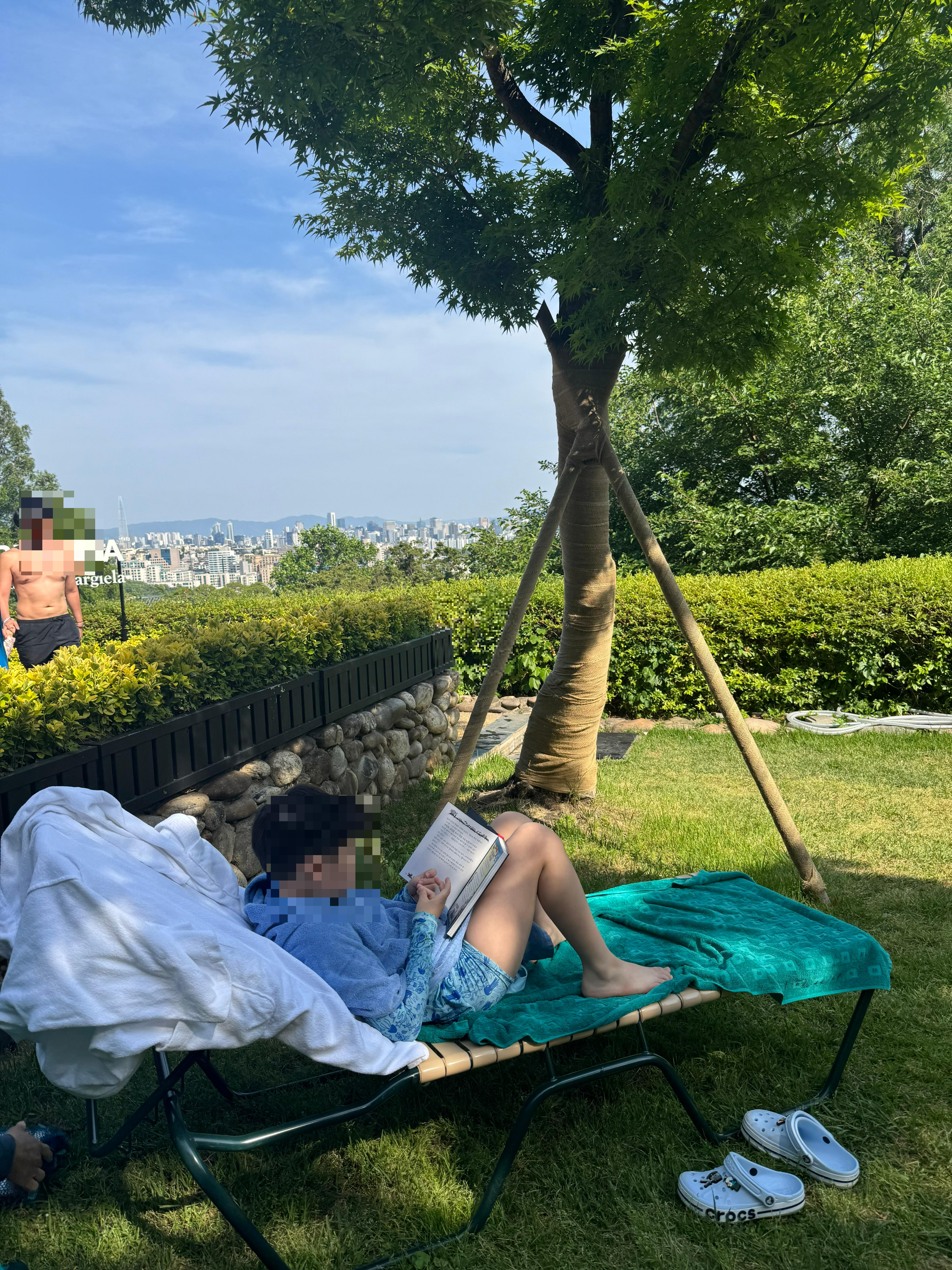 수영장 너머로 보이는 서울의 탁 트인 전망과 푸른 남산의 풍경은 그야말로 그림 같았어요. 수영장 바로 옆에는 넓은 잔디 광장이 펼쳐져 있는데, 이곳의 선베드에 누워 시원한 바람을 느끼고 있으니 마치 해외의 어느 고급 리조트에 와 있는 듯한 착각이 들 정도였죠. 파란 하늘과 초록 잔디, 그리고 시원한 물소리까지. 일상의 스트레스가 한 번에 날아가는 순간이었어요.